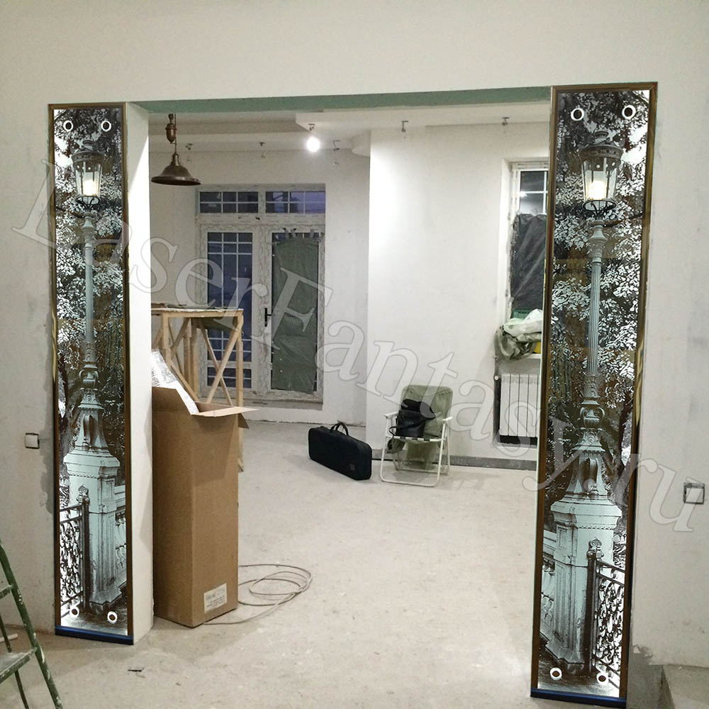 Оформление интерьера прихожей в загородном доме. Фото фонарей на стекле: 280х1800х8мм. -