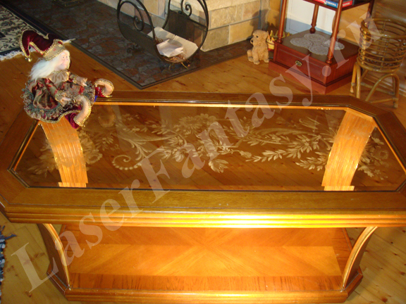 Стеклянная столешница с гравировкой. Лазерная гравировка на бронзовом, тонированном в массе стекле. Производство Москва