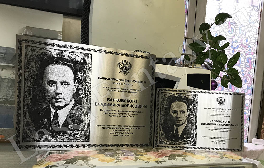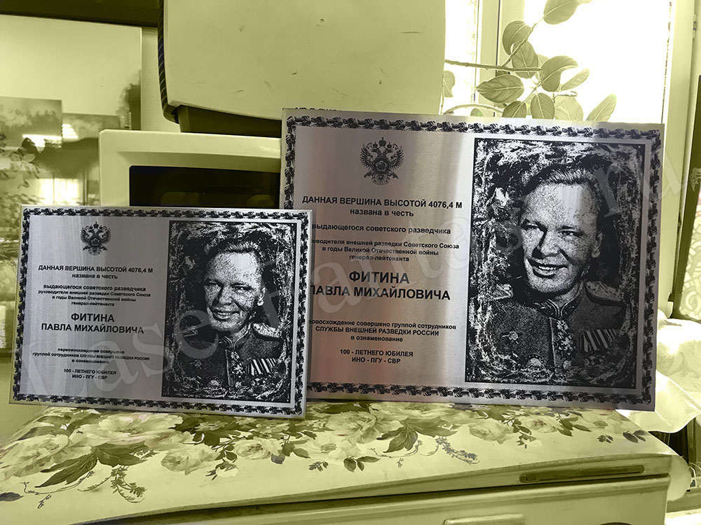 Памятные таблички из металла, установленные в горах в честь и в память советкого разведчика. -