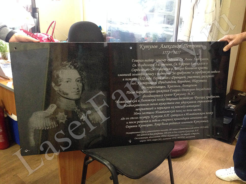 Гравировка портрета Кутузова А.П на граните Габбро Диабаз: 1200х600х20мм – благодарная память потомков. -